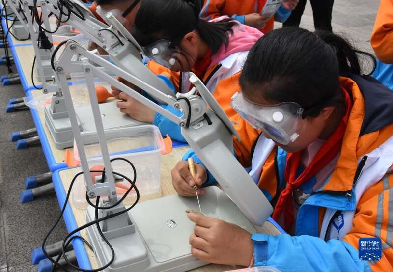 5月24日,在贵州省惠水县惠民小学,学生在贵州省地质博物馆工作人员指导下进行古生物化石修复体验活动。
