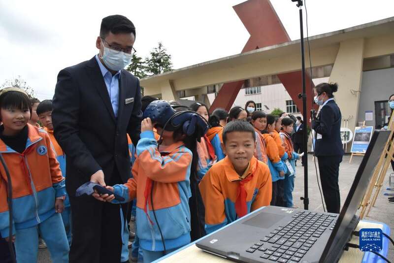 5月24日,在贵州省惠水县惠民小学,贵州省地质博物馆工作人员带领小学生进行VR科普互动体验。