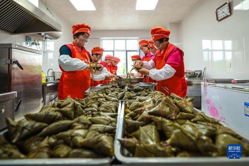 5月25日,在山东省荣成市寻山街道寻山所村暖心食堂,志愿者在为村里的老人包粽子。