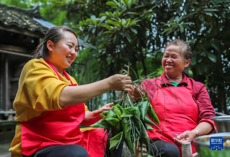 5月25日,村民在贵州省岑巩县思旸镇龙江村包粽子。