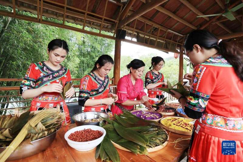5月25日,在广西融安县雅瑶乡章口村,村民在制作五彩粽子。