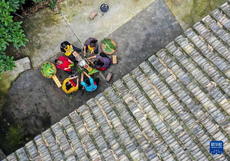 5月25日,村民在贵州省岑巩县思旸镇龙江村包粽子(无人机照片)。
