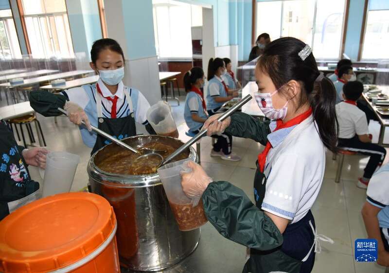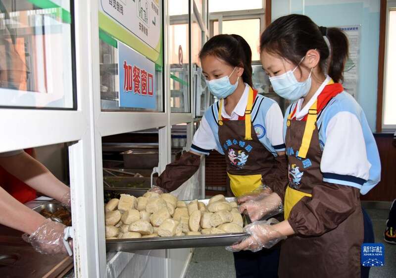 5月24日,青岛海逸学校的“小帮厨”在餐厅为同学提供服务。