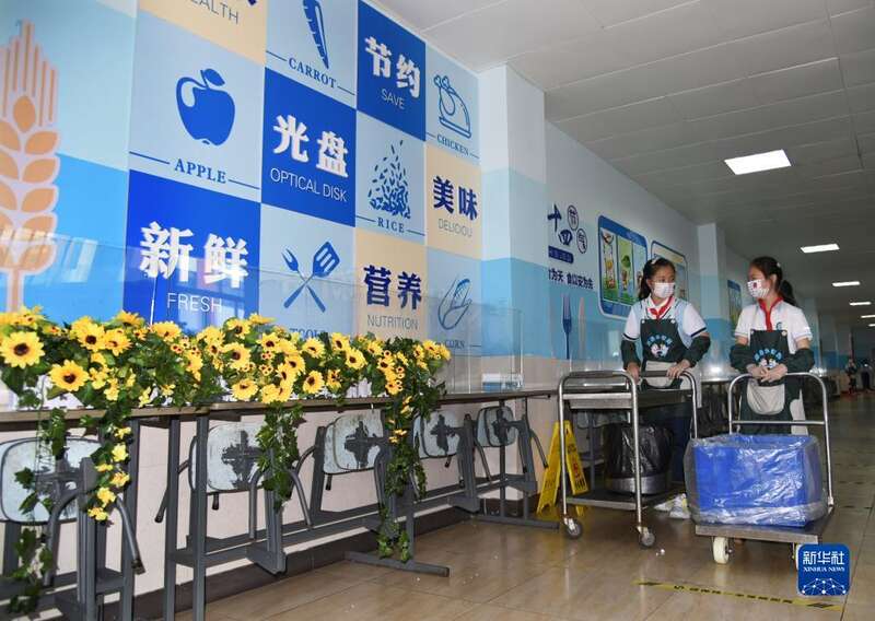 5月24日,青岛海逸学校的“小帮厨”在同学们用餐后打扫餐厅。
