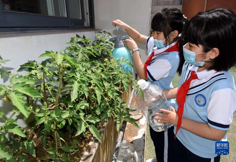 5月24日,青岛海逸学校的学生在为班级种植的蔬菜浇水。该学校为每个班配备了菜箱让学生体验种植的乐趣。