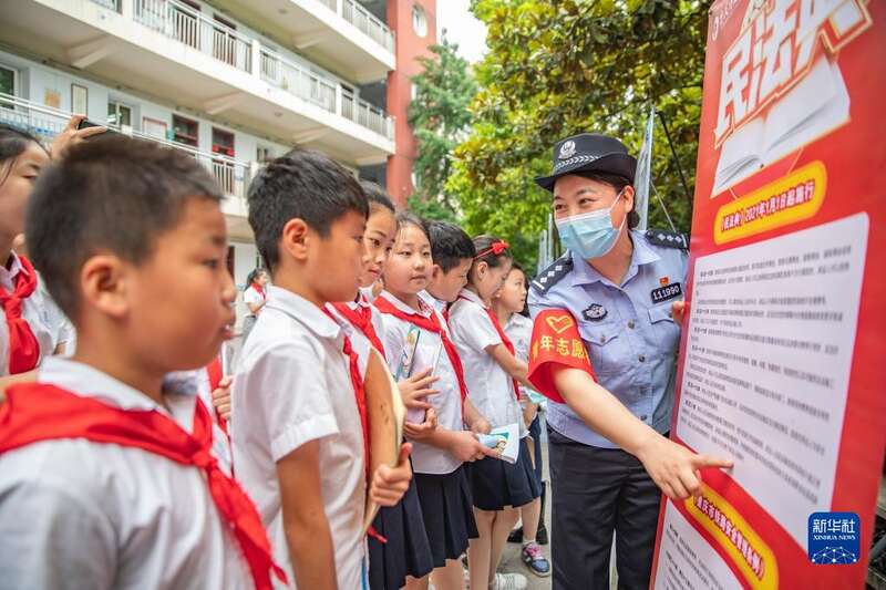 5月25日,在重庆两江新区人和小学,来自重庆铁路公安处的普法宣传志愿者在给学生们讲解铁路相关的法律法规。