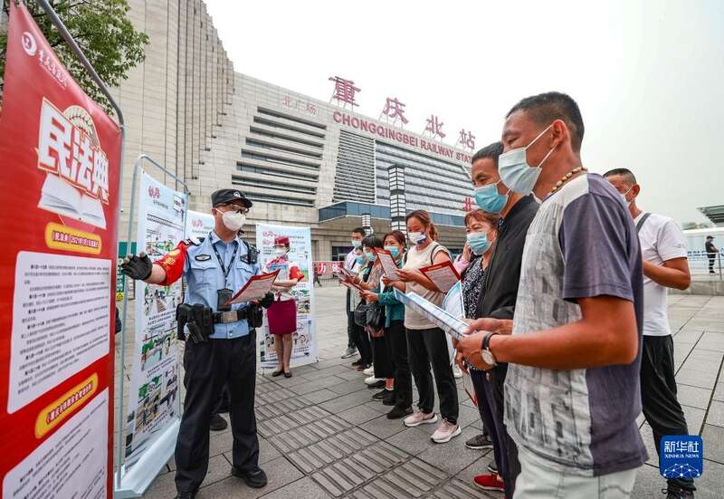 5月25日,在重庆北站北广场,来自重庆铁路公安处的普法宣传志愿者给旅客讲解铁路安全法律法规相关知识。
