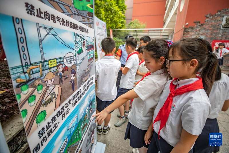 5月25日,在重庆两江新区人和小学,学生们在观看铁路安全宣传展架。