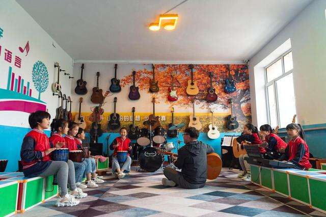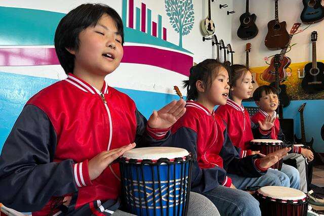 ↑“村里的孩儿”音乐班的孩子在进行乐队排练。