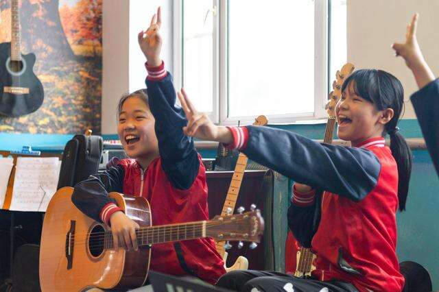 ↑“村里的孩儿”音乐班的孩子进行乐队排练时露出笑容。