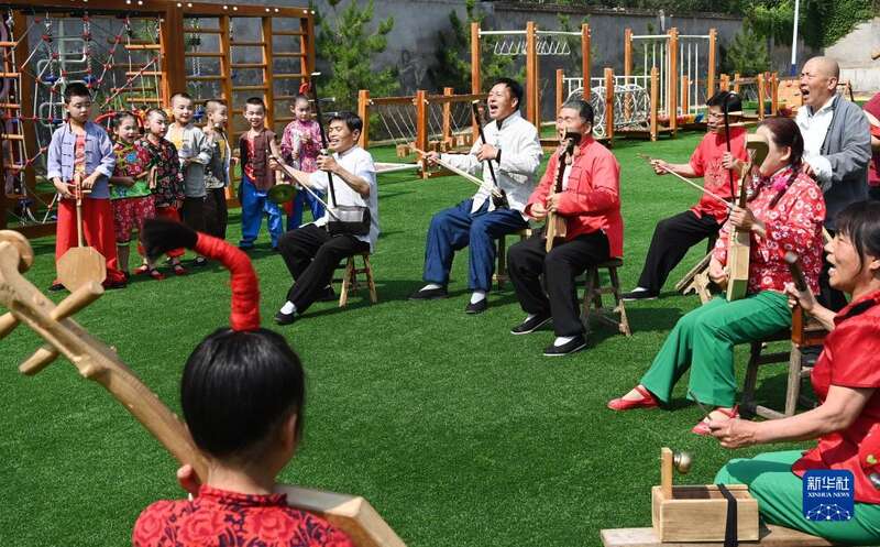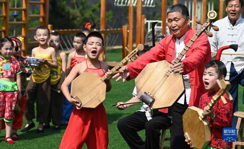 5月26日,黄河老腔艺术团的老艺人在幼儿园为孩子们传授老腔艺术技巧。