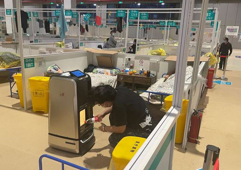 技术人员在国家会展中心(上海)方舱医院调试一台具有消杀功能的5G云端智能机器人(5月2日摄)。