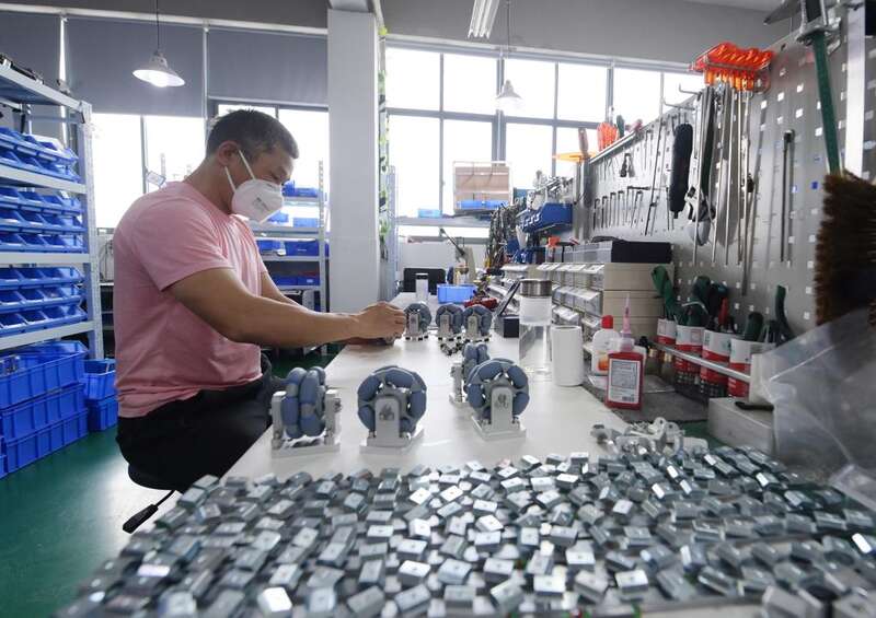 技术人员在上海浦东钛米机器人生产车间组装5G云端智能机器人零件(5月2日摄)。