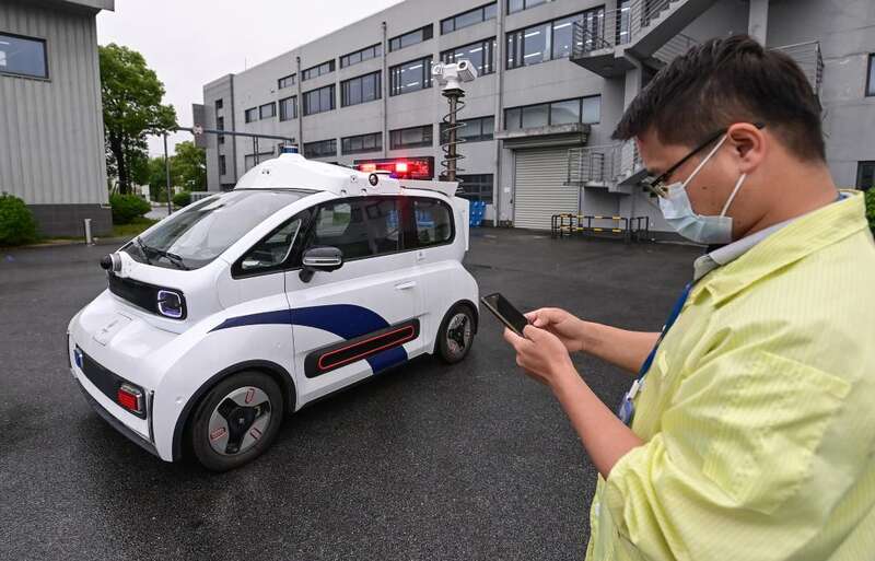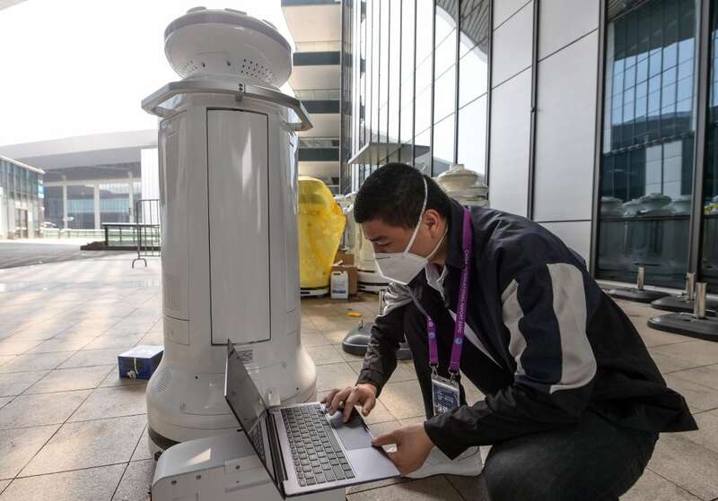 上海市闵行区达闼机器人有限公司技术人员展示5G云端智能巡逻机器人的功能。疫情期间,该公司在闭环下坚持生产,并为多家方舱医院提供产品支持(5月13日摄)。