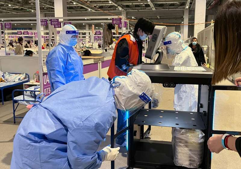 在国家会展中心(上海)方舱医院,志愿者和医护人员使用5G云端智能机器人配送餐食(5月19日摄)。