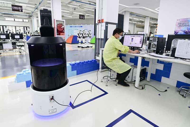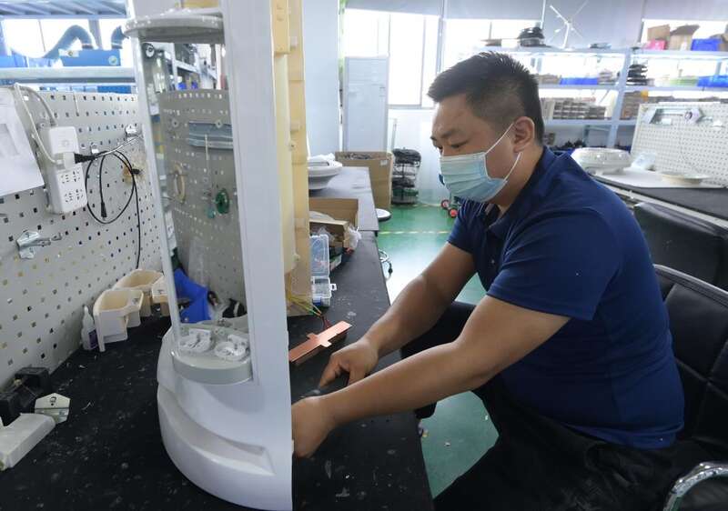 上海市闵行区达闼机器人有限公司技术人员检测一台5G云端智能服务机器人(5月13日摄)。