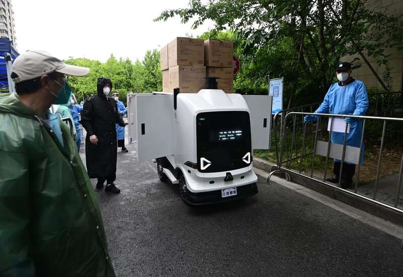 智能无人配送车在上海市宝山区淞南镇一小区为居民配送物资。疫情期间,该无人车运营机构同无人车生产方达成合作,尝试使用轻便灵活的无人配送车完成社区物流“最后100米”,减轻人工劳动强度(5月10日摄)。