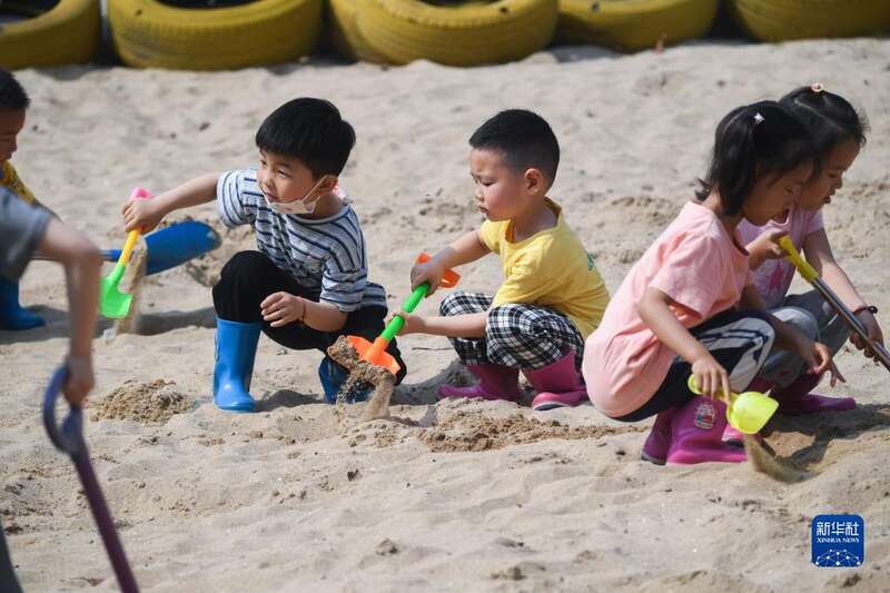 当日,浙江省慈溪市周巷镇天元实验幼儿园开启迎“六一”趣味“野玩节”。依托园内的土坡、沙坑、操场等不同地形,孩子们在老师的带领下分组体验沙中寻宝、快乐捉鱼等游戏环节,将乡村劳动场景融入游戏之中,从小培养热爱劳动、热爱大自然的情感。