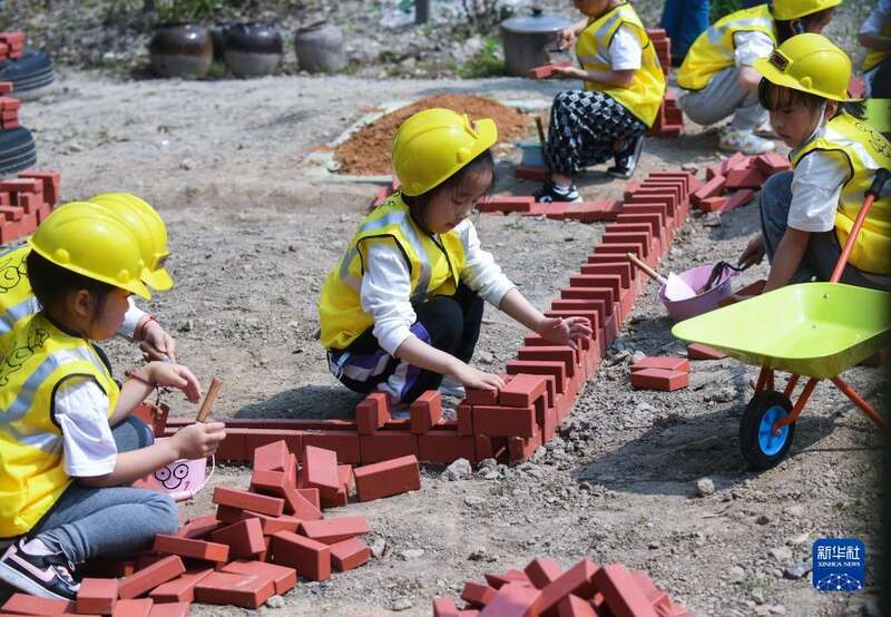 5月27日,孩子们在体验趣味造房子,模拟建筑工地“建房”。
