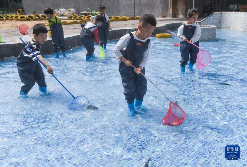 5月27日,孩子们在水池里参加快乐捉鱼活动。