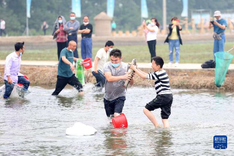 5月28日,在江苏淮安洪泽区岔河镇其虎村,村民和游客在插秧节上比赛摸鱼。