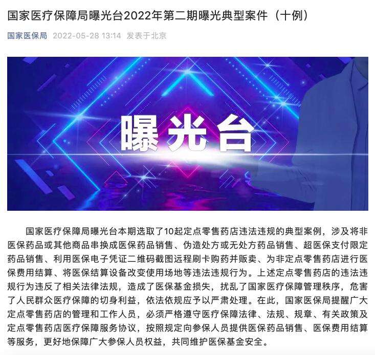 28日,国家医疗保障局曝光台选取了10起定点零售药店违法违规的典型案例,涉及将非医保药品或其他商品串换成医保药品销售、伪造处方或无处方药品销售、超医保支付限定药品销售、利用医保电子凭证二维码截图远程刷卡购药并贩卖、为非定点零售药店进行医保费用结算、将医保结算设备改变使用场地等违法违规行为。