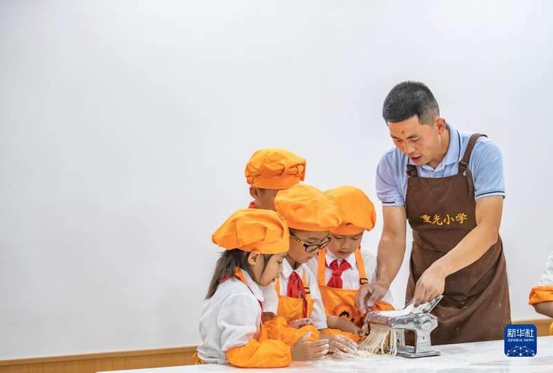 5月26日,重庆两江新区重光小学的学生们在“光小面”劳动课堂中学习制作面条。