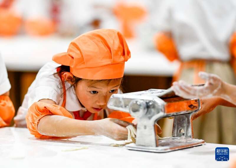 5月26日,重庆两江新区重光小学的学生在“光小面”劳动课堂中利用设备制作面条。