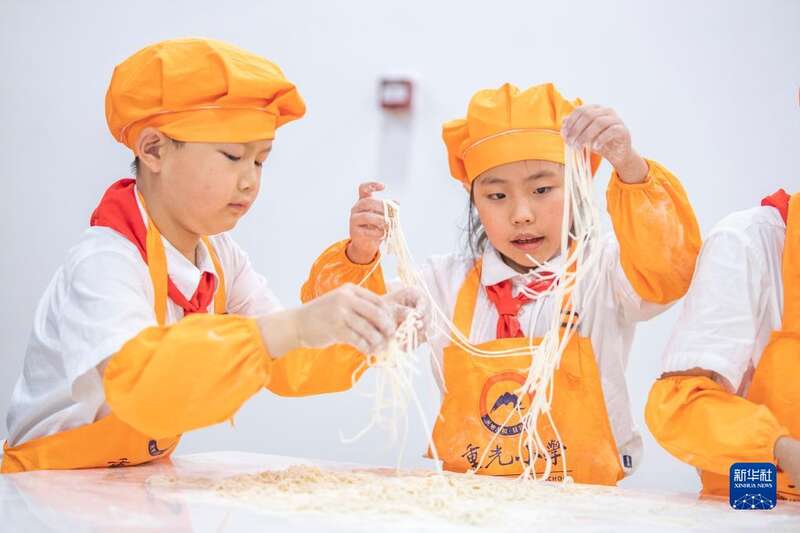 5月26日,重庆两江新区重光小学的学生们在“光小面”劳动课堂中将制作成型的面条摊开。