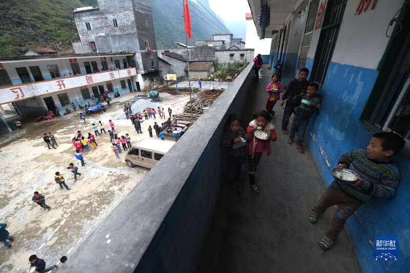 2014年11月19日,渔洞小学的孩子们在教室走廊和球场上吃午饭,当时学生餐厅还没有建好。