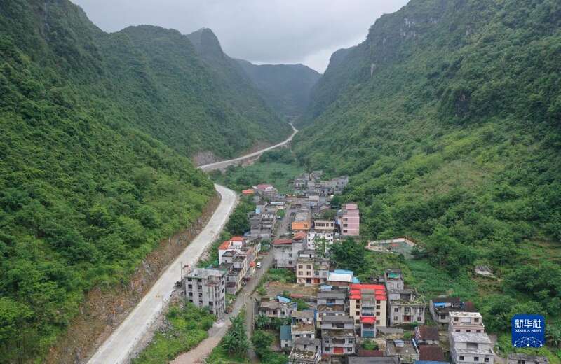 2022年5月26日拍摄的渔洞小学所在的渔洞村,二级公路穿村而过(无人机照片)。