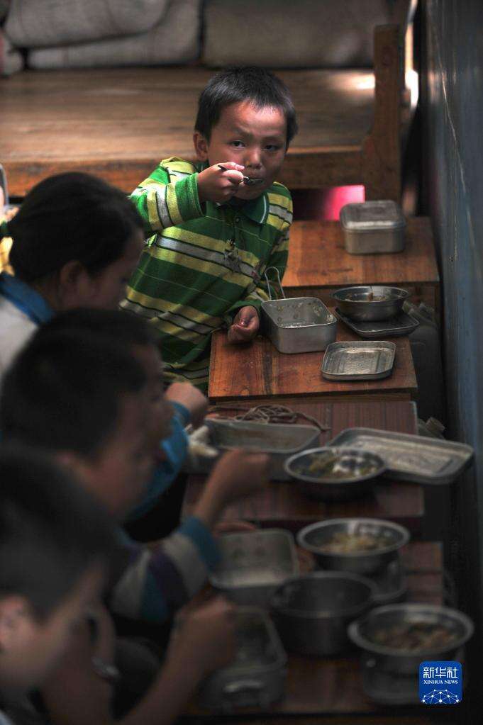 2012年5月30日,渔洞小学的孩子们在宿舍的木箱子上吃午餐,那时候,学校还没有餐厅。