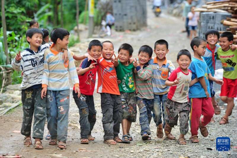 2012年5月30日,渔洞小学的孩子们在学校门口的通村公路上玩耍。那时,通村公路还是砂石路。