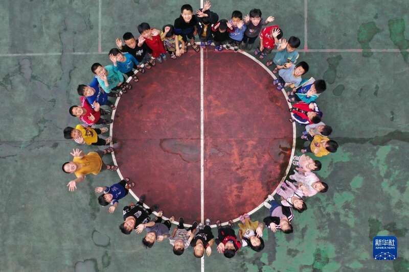 2022年5月26日,渔洞小学的孩子们在篮球场上合影(无人机照片)。