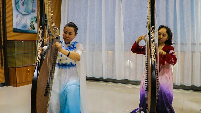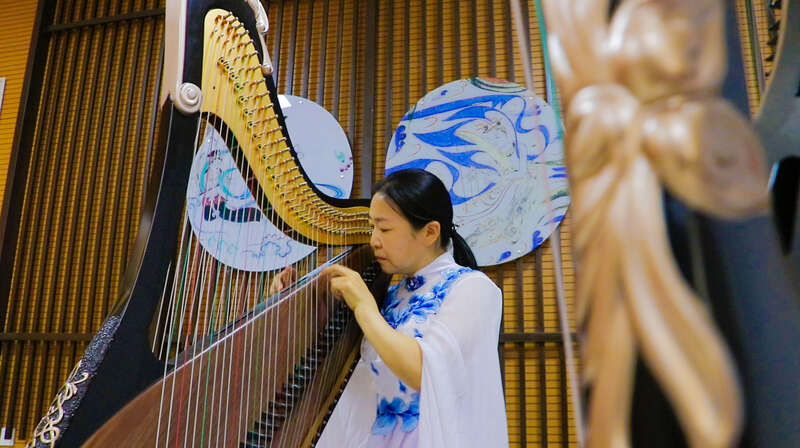 正在弹奏箜篌的阿依迪娜·亚森。 苏鑫 摄