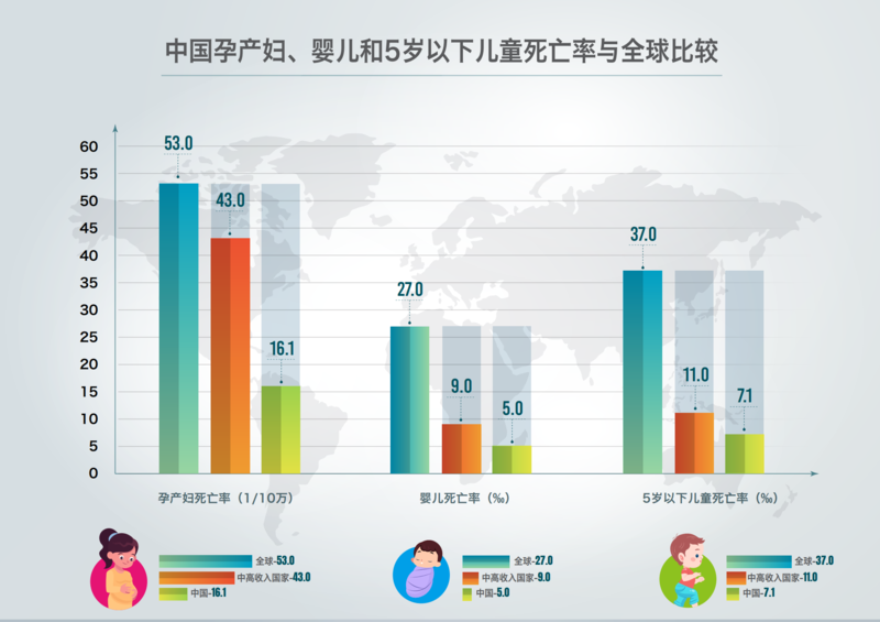 这张图显示出,我国目前孕产妇死亡率、5岁以下儿童死亡率和婴儿死亡率等妇幼健康的核心指标已经远低于全球的平均水平,也低于全球中高收入国家的平均水平。