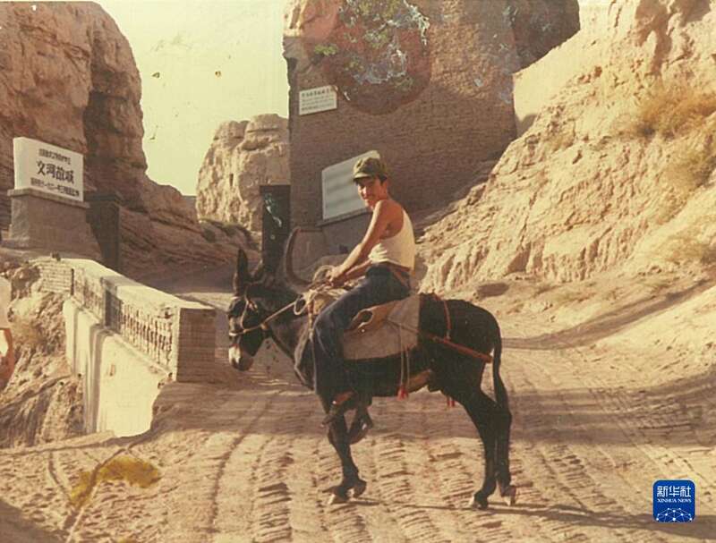 买明·热合曼在交河故城骑毛驴巡护(资料照片)。