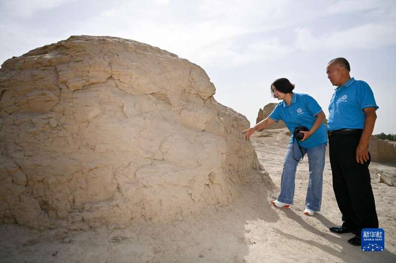 古丽拜克热(右)和父亲买明一起在交河故城巡护(5月20日摄)。