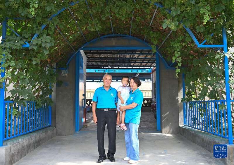 在新疆吐鲁番市亚尔果勒村,古丽拜克热(右)和女儿与父亲买明(左)在家门前合影。(5月20日摄)。