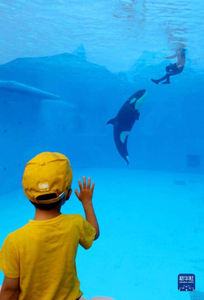 6月12日,一位小朋友在观看水中游动的小虎鲸。
