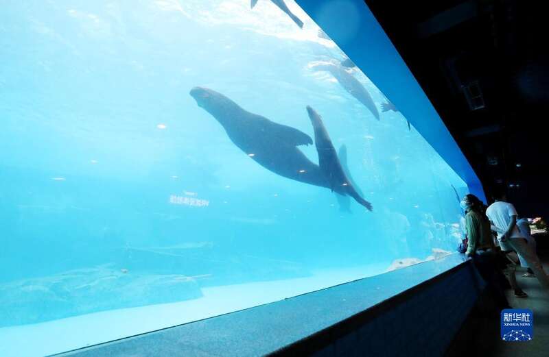 6月12日,游客在上海海昌海洋公园海兽探秘馆内观看水中游动的海豹。
