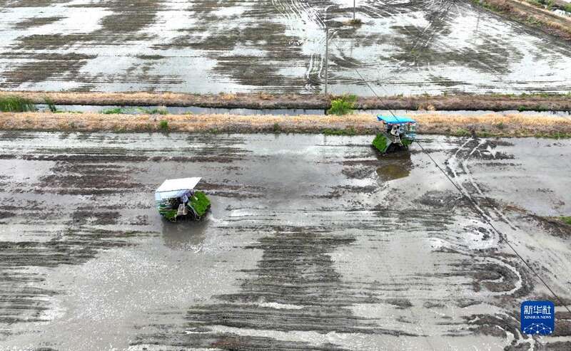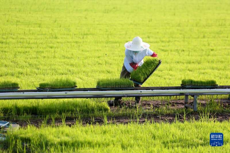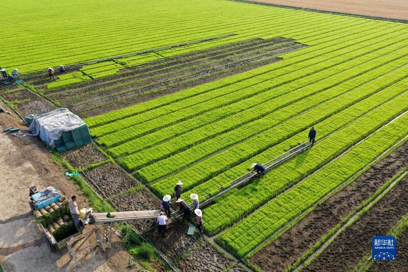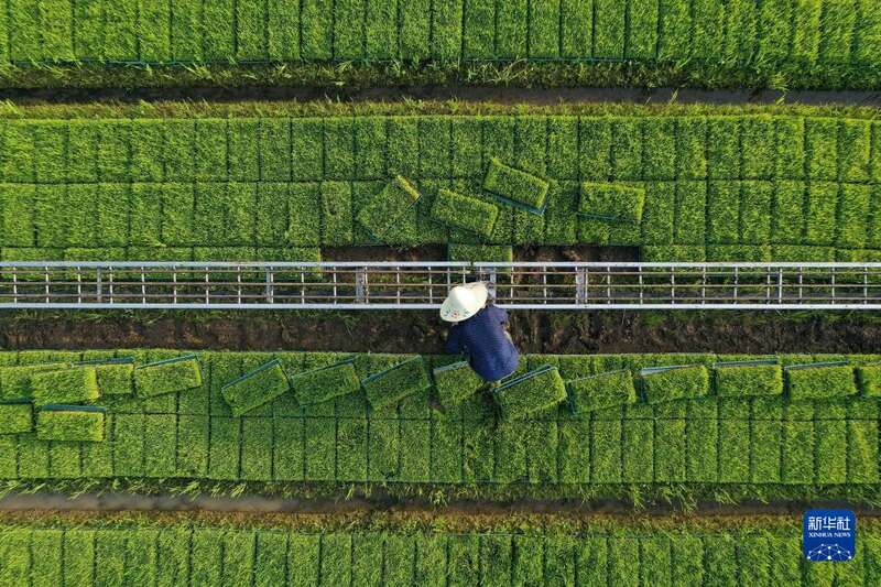 时下,江苏多地水稻进入大面积栽插季,当地农民抢抓农时加紧进行水稻起秧、转运、栽插作业。
