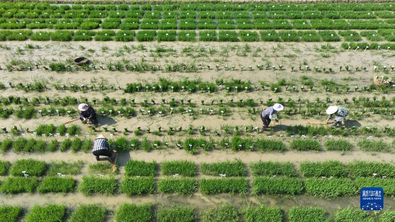 6月17日,农民在江苏省淮安市洪泽区岔河镇东陈村育秧田里起运水稻秧苗(无人机照片)。