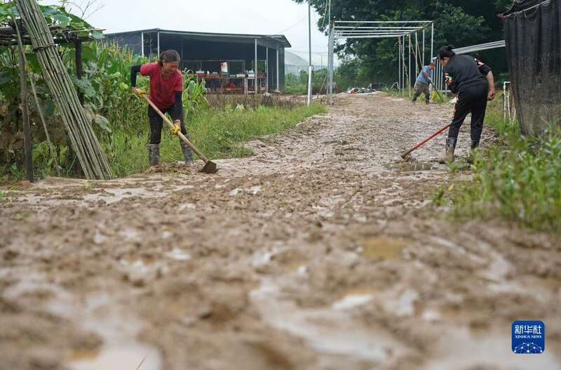 6月17日,在江西省龙南市桃江乡水西坝村,村民在清除淤泥,疏通道路。