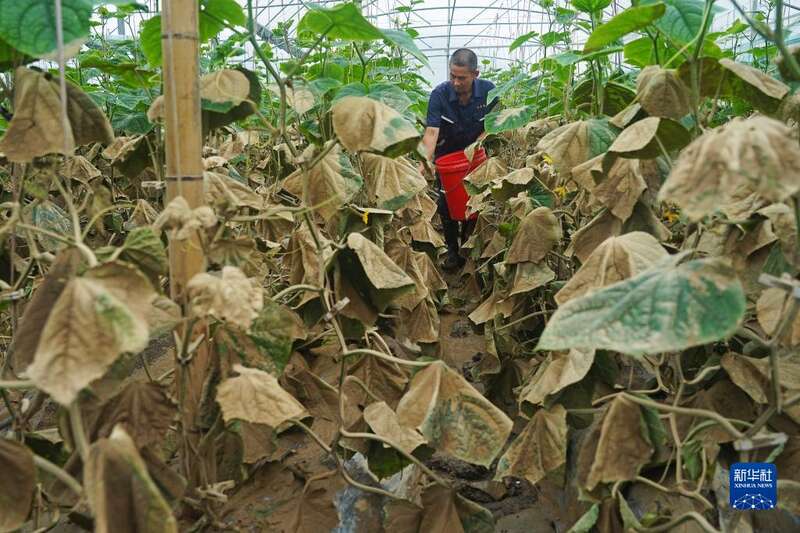 6月17日,在江西省龙南市桃江乡水西坝村的蔬菜大棚里,村民在查看被洪水淹过的黄瓜。