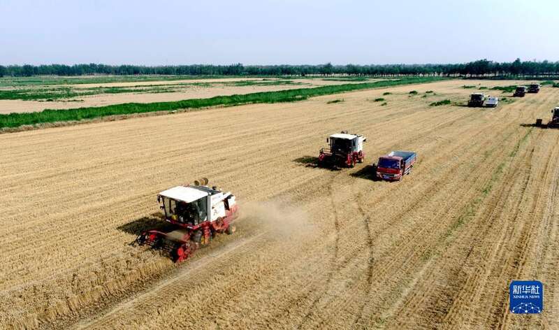 6月16日,在山东省东营市东营区牛庄镇金丰家庭农场的麦田里,收割机在收割小麦。