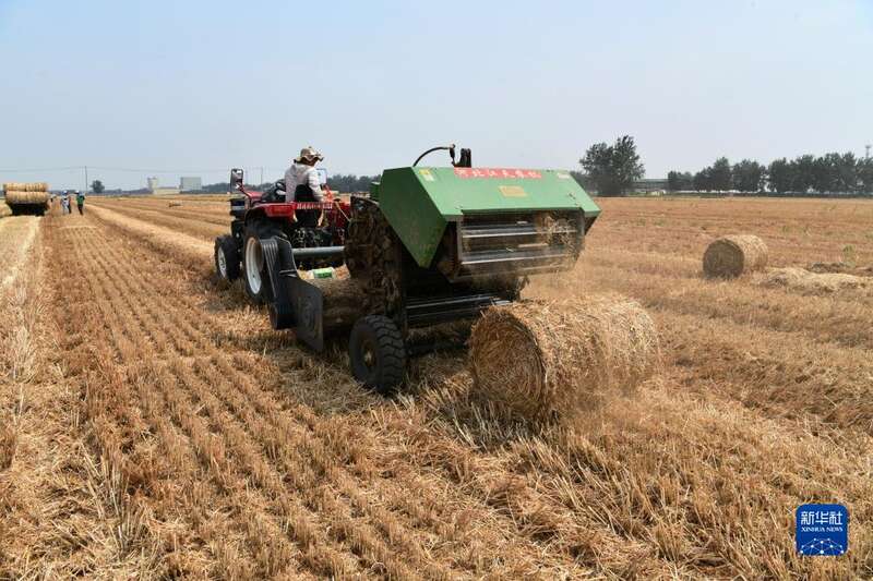 6月17日,在河北省石家庄市栾城区西营乡小代梅村,农民利用机械将小麦秸秆打捆。