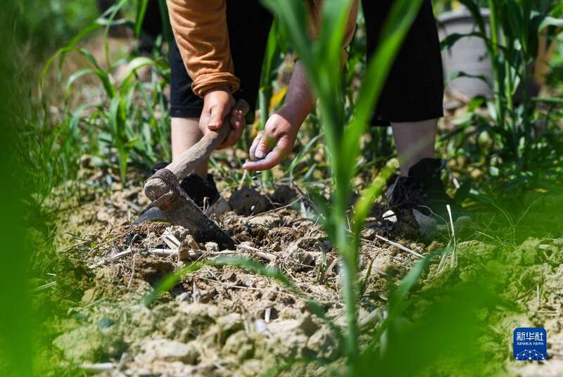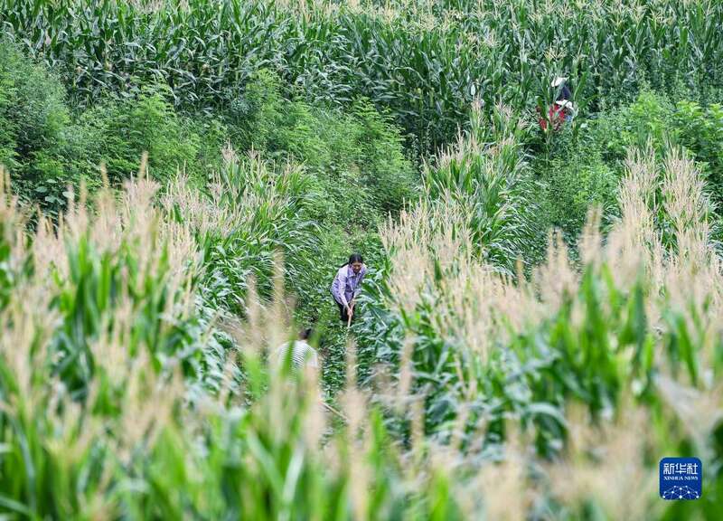 6月16日,在四川省达州市达川区石梯镇,当地农民在复耕种植玉米和大豆的农田里锄草。