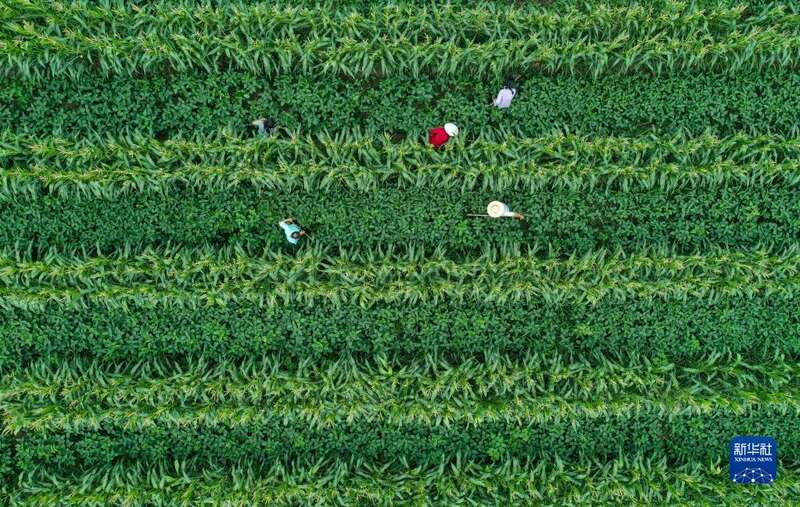 6月16日,在四川省达州市达川区石梯镇,当地农民在复耕种植玉米和大豆的农田里锄草(无人机照片)。