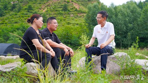 阜平县顾家台村党支部书记顾锦成(中)、香菇种植户杨伟彦(左)共同讲述当地产业扶贫故事。